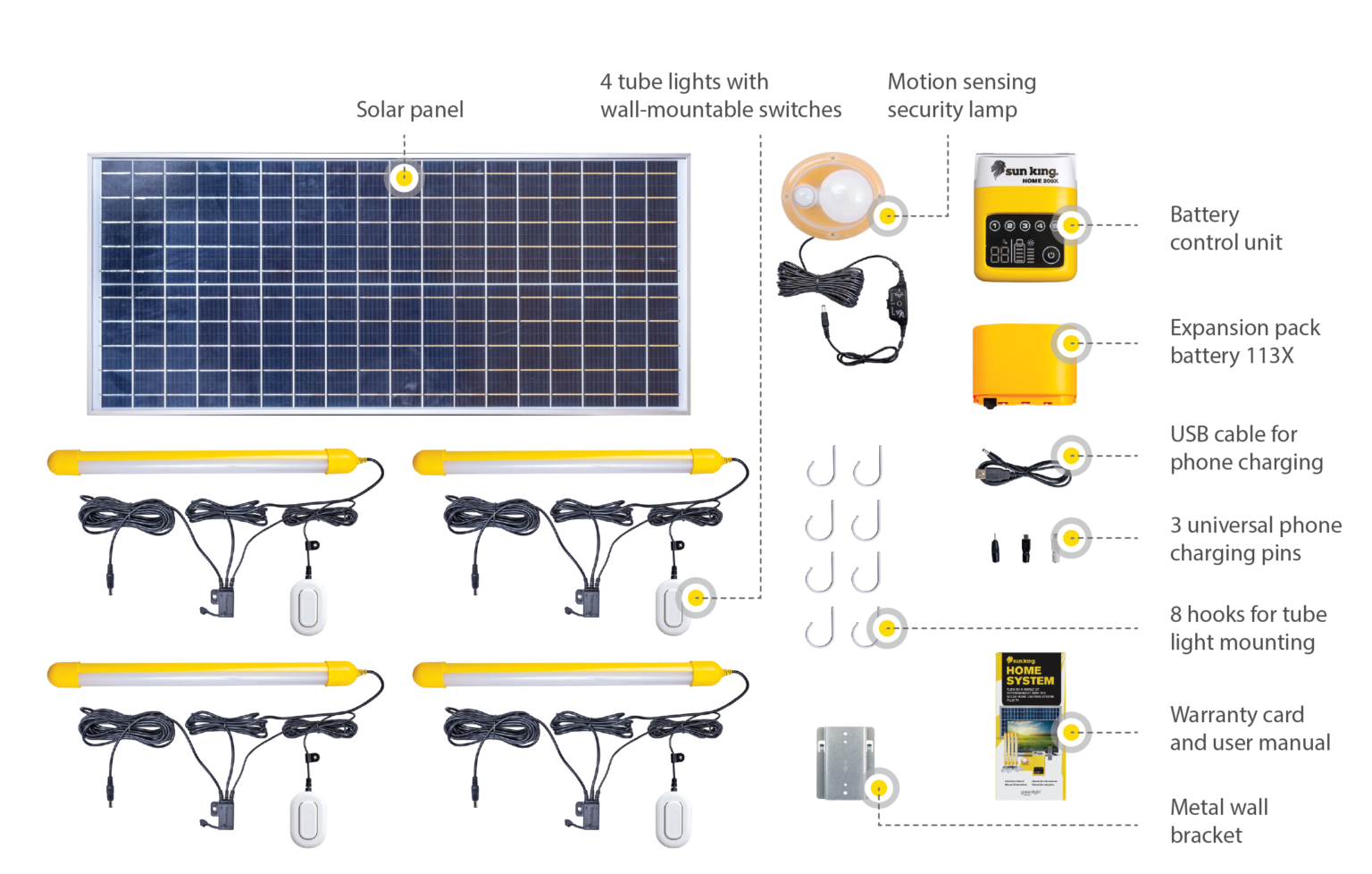 Charge multiple devices and light several rooms with this state-of-the-art solar home system. Combining four 200 lumen tube lights, USB charging for smartphones, and a motion sensor security light, the Home 500X provides businesses and families with essential, reliable lighting and power.